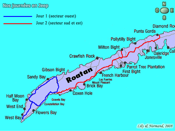 Durant la première journée, nous avons visité West End, Sandy Bay, Antony’s Key et Coxen hole (la capitale de Roatan). La deuxième journée, c’était le secteur est, soit l’hôtel Fantasy Island, le point de vue de nikki beach et jusqu’à Paya Bay. Pour vous donnez une idée des distances, de Paya Baya à Coxen hole (aéroport), 33 km = 45 minutes).