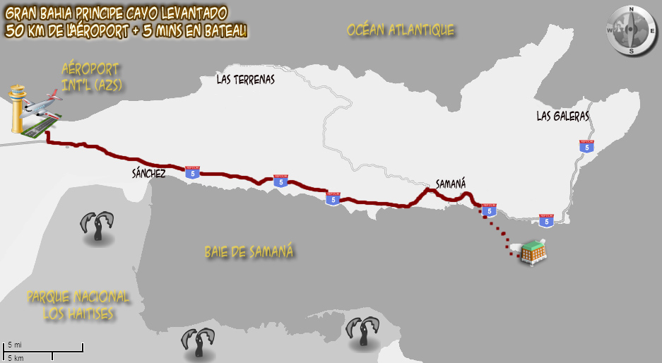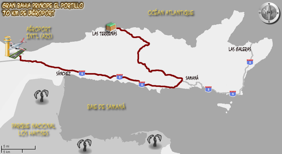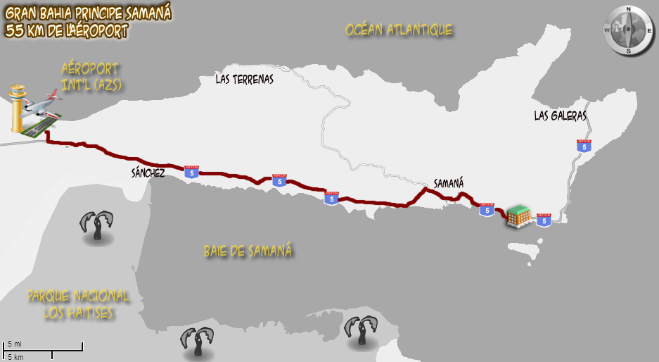Les hôtels de Samaná sont desservis par l'aéroport international El Catey Juan Bosch (AZS) inauguré le 7 février 2007, mais en service depuis le 6 novembre 2006. L'aéroport est situé à environ une heure du Gran Bahia Principe Cayacoa et une heure trente du Gran Bahia Principe El Portillo. C'est un aéroport neuf, climatisé, offrant plusieurs services, dont un magasin hors-taxe, restaurants, salon VIP, etc. Cliquer ICI pour voir nos photos de l'aéroport et ses services. Les autocars sont climatisés et les routes pour desservir les hôtels sont en bitumes. Comme certaines de ces routes sont amochées, il y a beaucoup de travaux de rénovation des routes. D'ici quelques années, le transfert sera surement plus court et plus agréable.